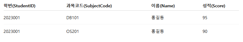 이름 속성의 경우 학번에는 종속되지만 과목코드에는 종속되지 못합니다. 이 때 부분 함수 종속이 발생합니다.