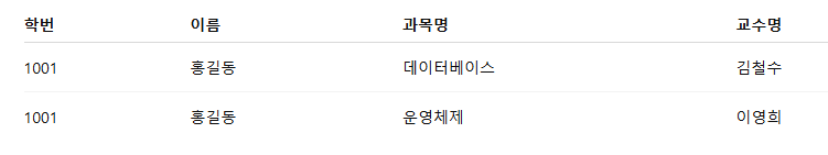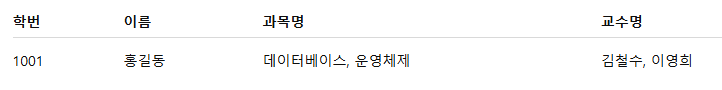 아래는 비정규형의 데이터인데요. 과목명, 교수명 속성에서 1정규형 위반이 발생했습니다.