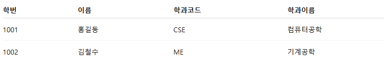 아래 예제에서 학번이 학과코드를 결정하고 학과코드가 학과이름을 결정합니다.