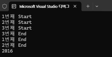 Console.WriteLine($"{i}번째 End");
