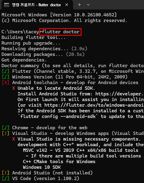 7. cmd 창을 열고 "flutter doctor"라고 입력합니다.