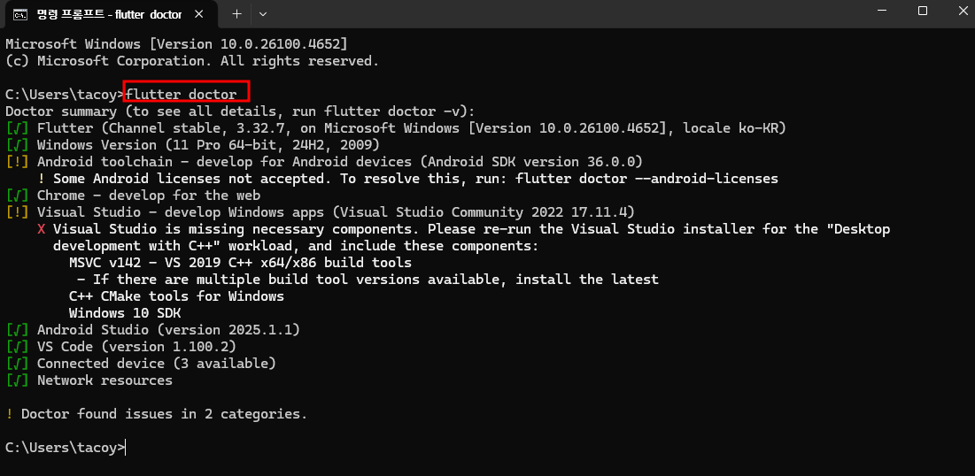 4. 설치가 잘 되었나 확인하기 위해 cmd 창을 열고 "flutter doctor" 입력하고 엔터 눌러주세요.