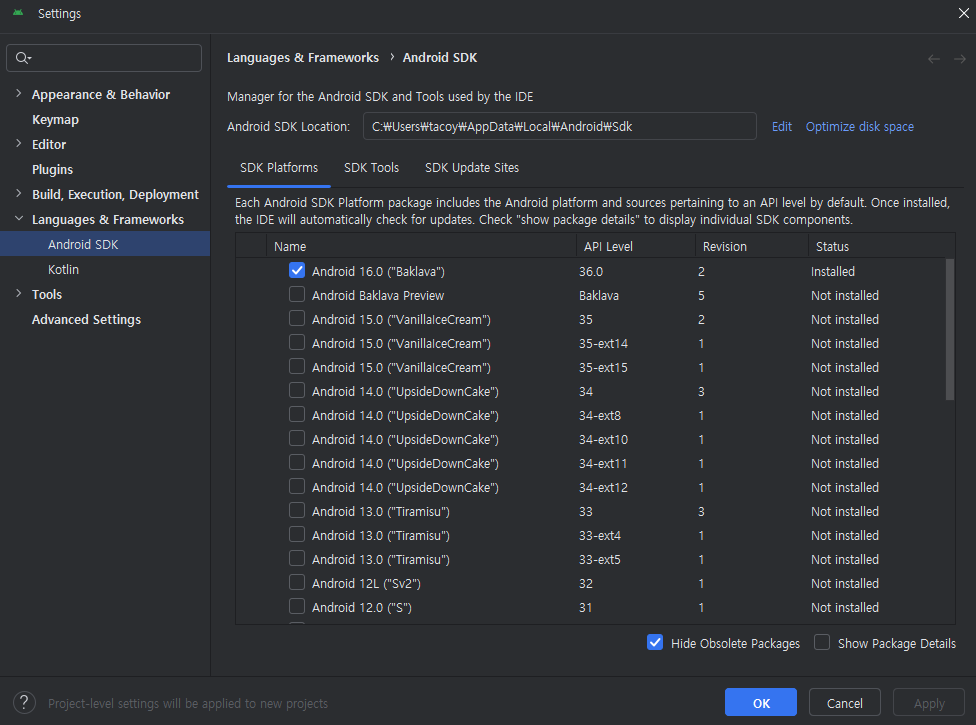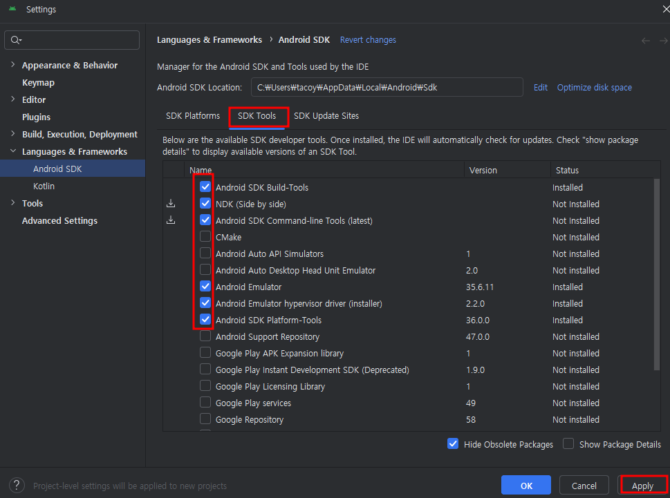 3. SDK Tools 들어가서 아래 처럼 체크 한 뒤 Apply 눌러 주세요. 그럼 팝업 창이 뜨는데 동의한 뒤 Next 해주면 됩니다.