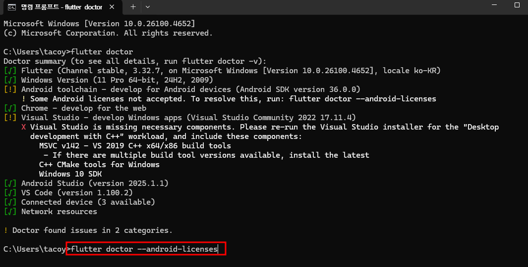 5. 안드로이드 오류 해결을 위해 아래와 같이 입력해주세요. "flutter doctor --android-licenses"