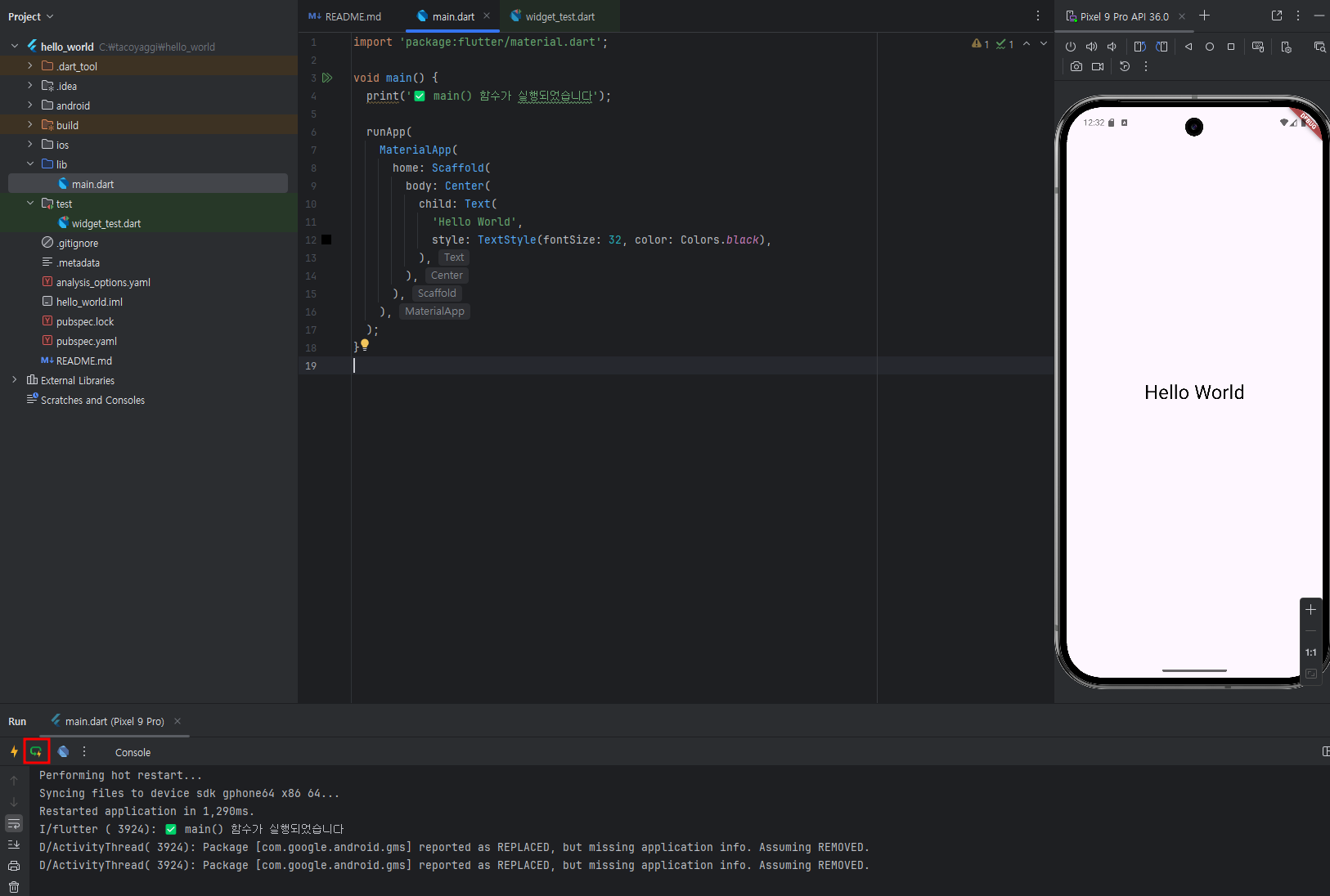 하단에 restart 해주면 Hello World가 찍히는걸 볼 수 있습니다.