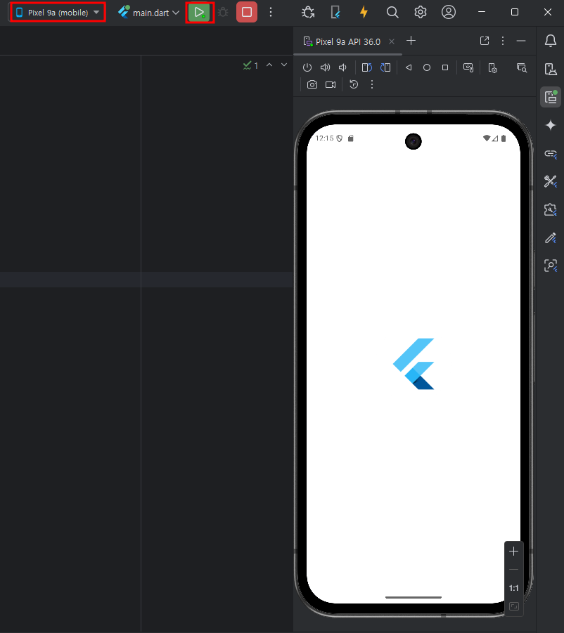 emulator 실행중인 상태에서 상단의 start 버튼을 눌러주세요.