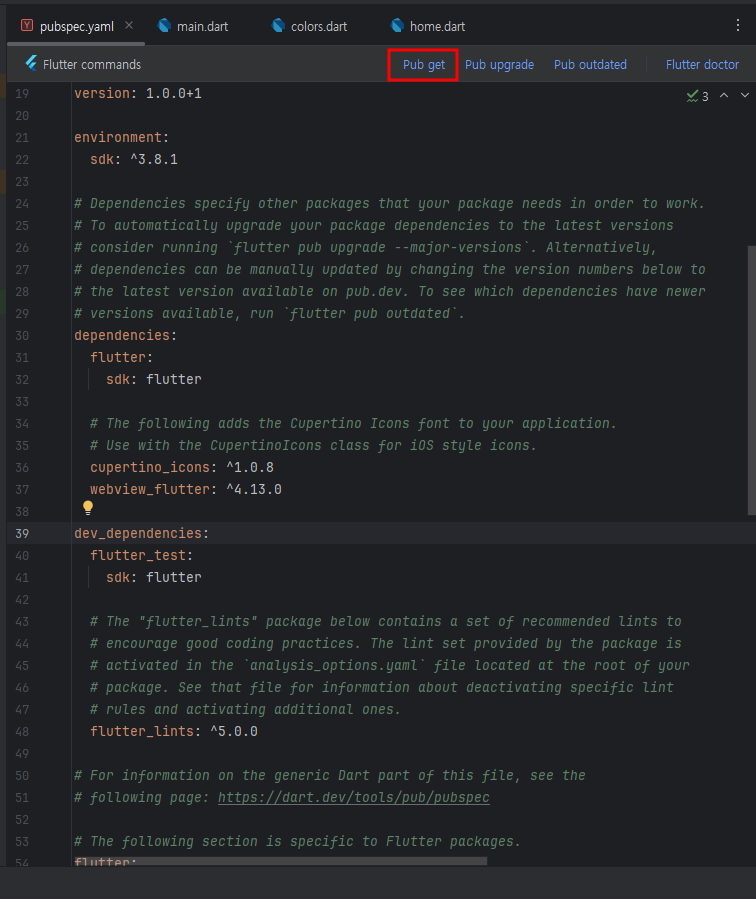 우측 상단쯤에 있는 pub get 누르면 console 뭐라뭐라 뜨면서 설치가 진행됩니다.
